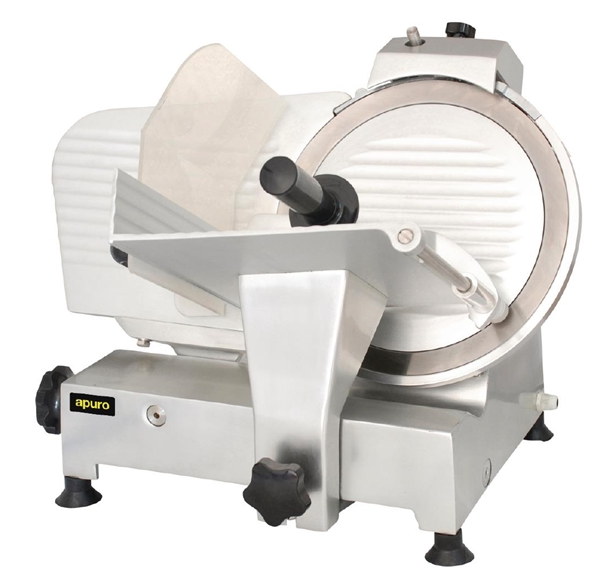 Save time and reduce waste with the sturdy and reliable Apuro meat slicer. Featuring a large 300mm blade with integral sharpener, you can easily and precisely slice large quantities of beef, ham, poultry or vegetables with the minimum of fuss. The built-in guards and non-slip feet promote safe operation, whilst the adjustable thickness control ensures food is consistently sliced as required, guaranteeing perfect portion control. A high quality commercial meat slicer ideal for deli counters, sandwich shops, restaurants and many more. Not suitable for cheese.