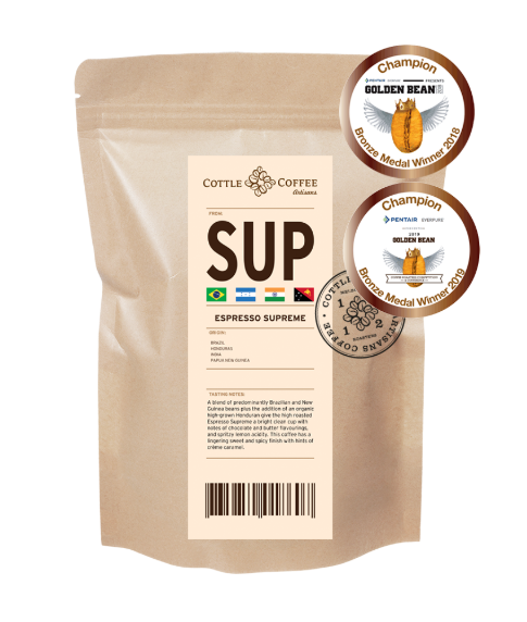 A blend of predominantly Brazilian and New Guinea beans plus the addition of an organic high-grown Honduran give the high roasted Espresso Supreme a bright clean cup with notes of chocolate and butter flavourings, and spritzy lemon acidity. This coffee has a lingering sweet and spicy finish with hints of crème caramel.