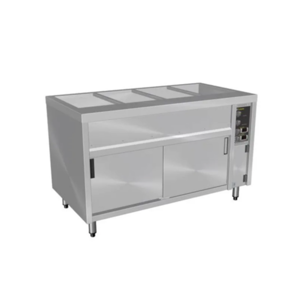The Culinaire® Island Bain Marie Hot Cupboard features a high powered heavy duty Bain Marie that is designed to hold hot food at the optimum temperature in GN pans up to 150mm deep (sold separately). Wet or dry operation (temperature varies greatly when run dry, should not be left unattended for long periods of time). The hot cupboard features a fan forced heating system, which offers energy saving efficiency, faster heat-up times and even heat distribution. Ready for connection to hot water inlet and waste with all valves supplied and fitted. Options: Lift up, fold down work shelf (factory fitted), Left hand controls, Radius Well.