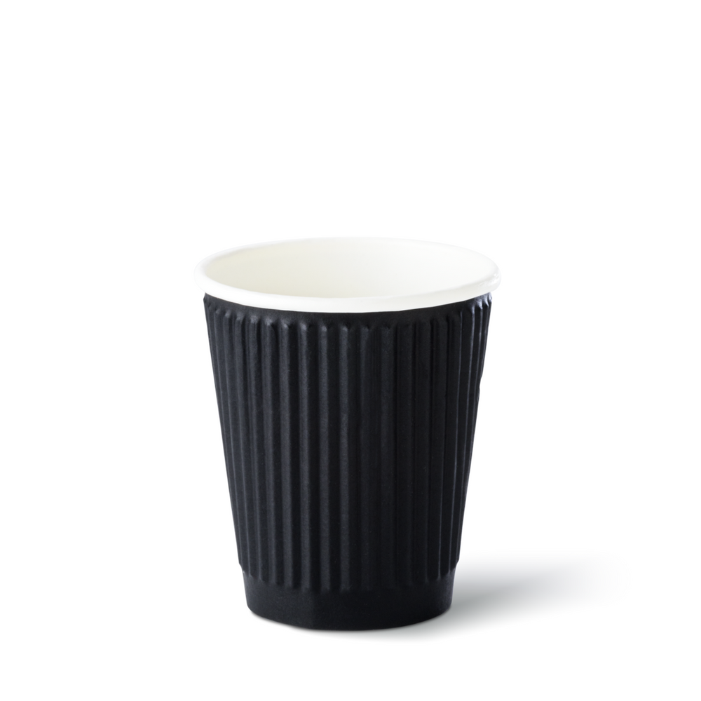 Ripple-Wrap™ hot cups feature a corrugated wrap that keeps hands cool and coffee hot. They're perfect for very hot drinks like tea and coffee. The 8oz cup is offered in black.
