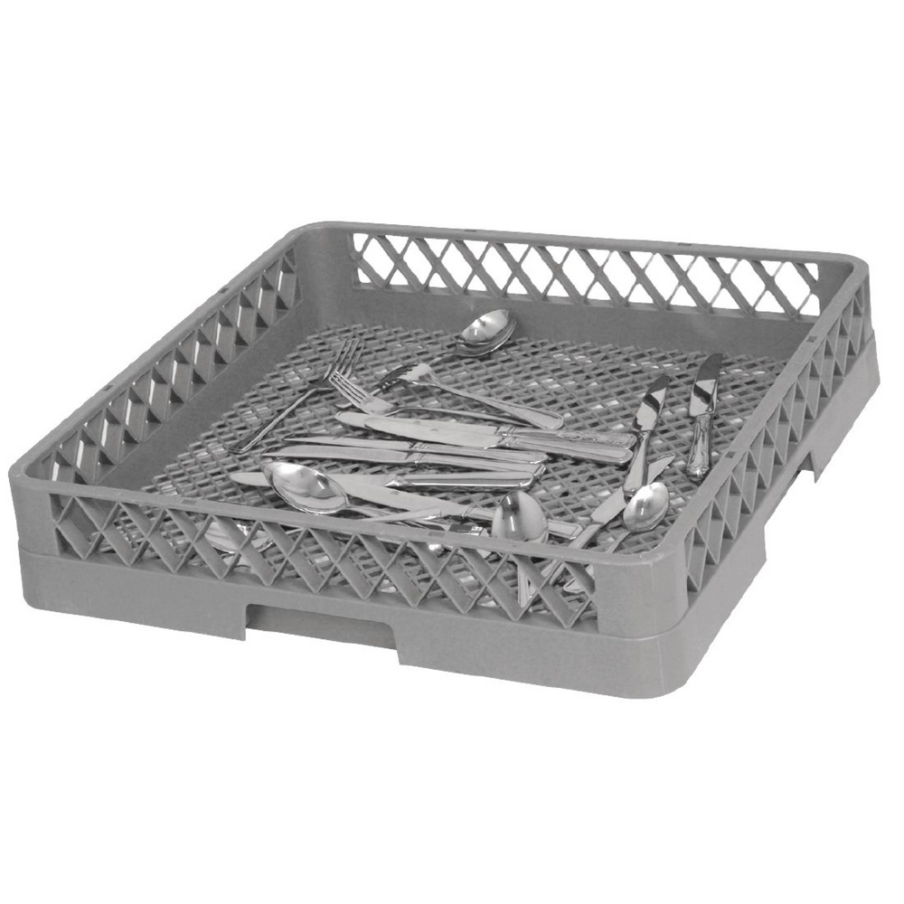 A cutlery dishwasher rack features an open bottom design, making it perfect for use in dishwashers as well as for soaking flatware in sinks. The open design makes for superior washing as well as complete rinsing and fast drying, perfect for busy kitchens that need cutlery cleaned and dried quickly.