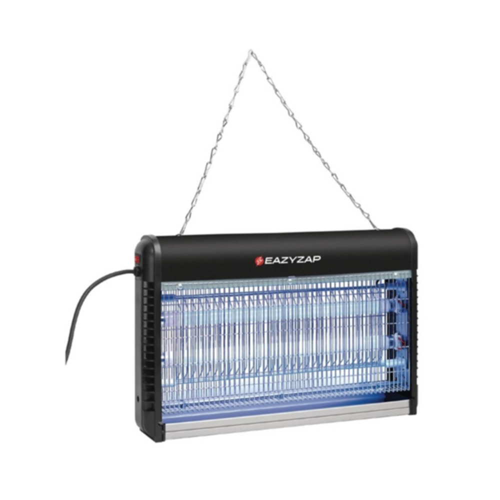 This fly zapper comes with its own hanging chain, and it performs best when positioned in the darkest part of the room. Placing it near light sources such as skylights or windows will limit its effectiveness. It also needs to be set up at least 1m away from any food preparation areas.