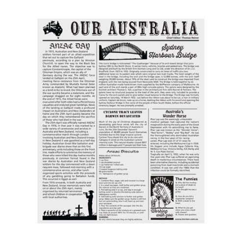 Each sheet features news articles, a recipe for Anzac biscuits and three jokes to entertain your customers.