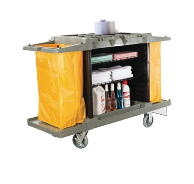 This robust and reliable housekeeping trolley is able to withstand busy daily use in fast-paced cleaning rolls and environments. The trolley also features a full size cabinet for exceptional storage of cleaning products and equipment, allowing for quick and efficient cleaning of hotel rooms and public spaces.