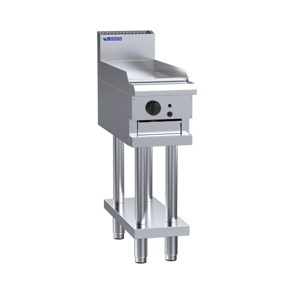 Enjoy premium grilling performance with the Luus 300mm wide Griddle. This compact 800mm deep unit features a 21mm mild steel plate with Piezo ignition, perfect for restaurants, food trucks, and more. With a bench top or freestanding option, and an undershelf storage area, this product offers superior grilling convenience.