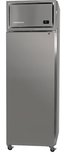 The SKOPE ProSpec 1 Solid Door Upright 2/1 GN Fridge PG21.UPR.1.SD [FK657-A] offers ample storage for up to 572 liters in a 0.63m2 area. Its self-closing, lockable, solid swing door stays open at a 90° angle, and the interior & exterior are made of 304 AISI stainless steel. The temperature range can be adjusted from 1°C to 4°C, with a max ambient temperature of 40°C. It runs on R290 natural refrigerant, consuming only 2.20kWh/24h with a current draw of 3.0amps.