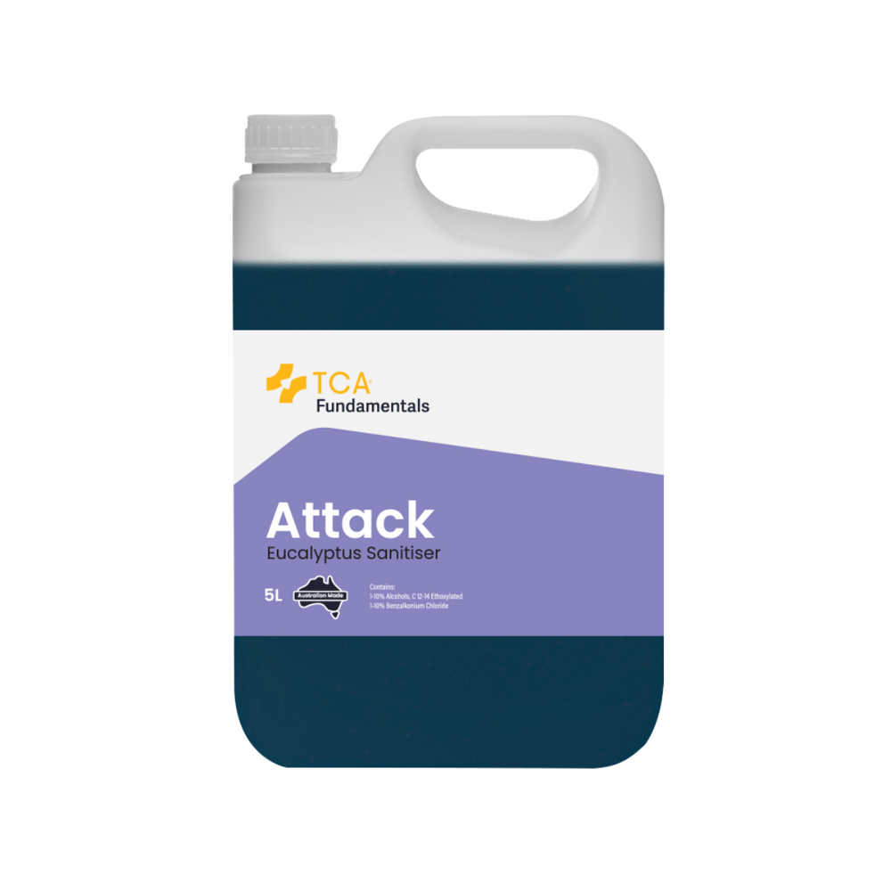 Attack is pH neutral and safe to use on most surfaces where sanitation is required including floors, hard surfaces and washroom areas such as toilet seats, tapware and basins. Attack contains a minimum 2% benzalkonium chloride which provides effective sanitation across a wide range of bacteria.