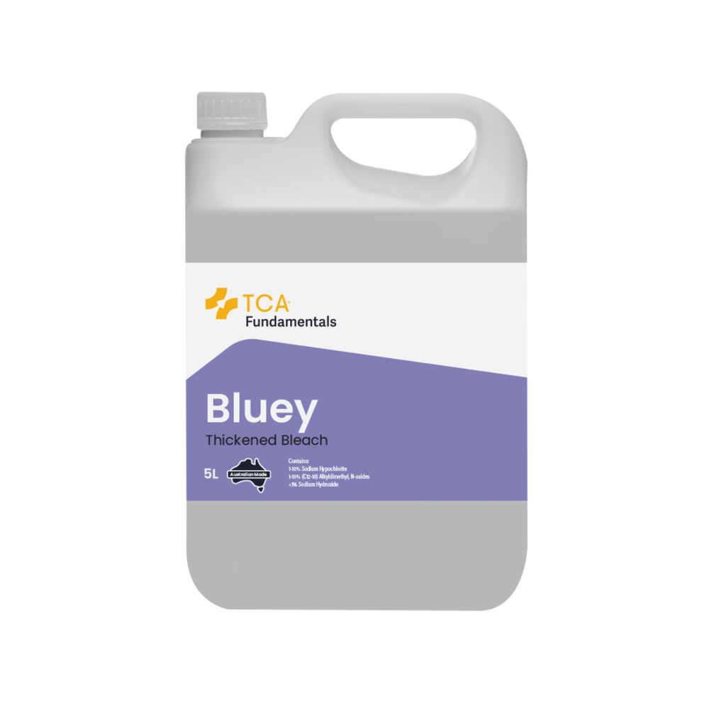 Bluey is a commercial grade thickened liquid bleach gel solution which contains 3% Sodium Hypochlorite. Ideal for stain removal and brightening fabrics in laundries, kitchen cleaning, toilet and washroom cleaning and a variety of applications where a fast acting sanitiser and cleaner is required. Bluey is also a very effective cleaner for Butcher Shops and commercial kitchens as it has excellent cleaning properties and is suitable for food applications as it leaves no taint once rinsed with water. Designed for modern bathrooms to reduce mould and provide effective fast and easy cleaning without the harsh caustic content of stronger chlorinated foaming detergents. Bluey is not considered a dangerous good.