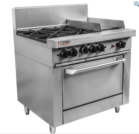Featuring 24MJ open burners with pilots and flame failure for safety, this lightweight oven offers durable, flush cast iron trivets and Combination Burner/Griddle units in various widths. An engineered pull-down door and insulated cavities ensure heat retention, while the enamelled interior allows for easy cleaning. Mix-and-match burner and griddle combos provide flexibility and fast-heating efficiency. External Dimensions: 900Wx 803D x 1135H mm, Working Height: 910mm, LPG. Combustible wall clearance: Side 150mm, Rear: 150mm.