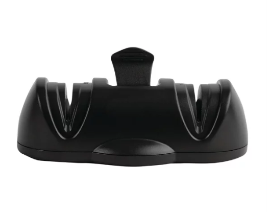 This manual sharpener has a diamond wheel with a tough abrasive surface to sharpen blunt knives and a ceramic wheel to achieve a finer edge. The sharpening angle is pre-set for straight, smooth edge knives. It only takes four or five passes to sharpen your knife, and one pass to maintain the sharp edge.