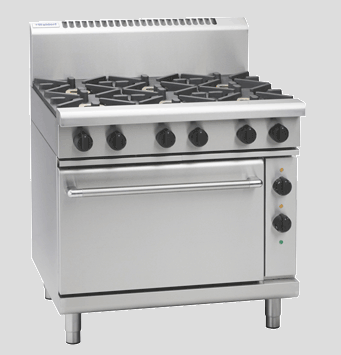 6 burner cooktop range 2/1 GN gas static oven 6 x 28MJ/hr open burners Heavy-duty stainless steel finish Flame failure protection on all burners Removable heavy-duty cast iron burners and vitreous enamel pot stands Heavy-duty reinforced control knobs Drop down door with welded frame Oven lining is welded and lined with vitreous enamel Cool touch stainless steel door handle Adjustable feet and 2 additional rollers Easy clean, installation and service